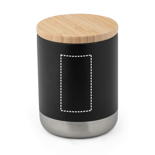 Isolierbecher aus Edelstahl (36% recycelt) (370 mL), doppelwandig und vakuumisoliert mit Deckel aus Bambus und Silikondichtung. Der Reisebecher hält Getränke bis zu 5 1/2 Stunden heiß und bis zu 24 Stunden kalt. Die Beschichtung auf der Oberfläche gewährt diesem Artikel mehr Resistenz und Haltbarkeit. Geliefert in einer Geschenkschachtel aus Kraftpapier. Da das Produkt aus natürlichen Materialien hergestellt wird, können Farbe des Produkts sowie das Druckergebnis von Produkt zu Produkt unterschiedlich sein. ø80 x 106 mm